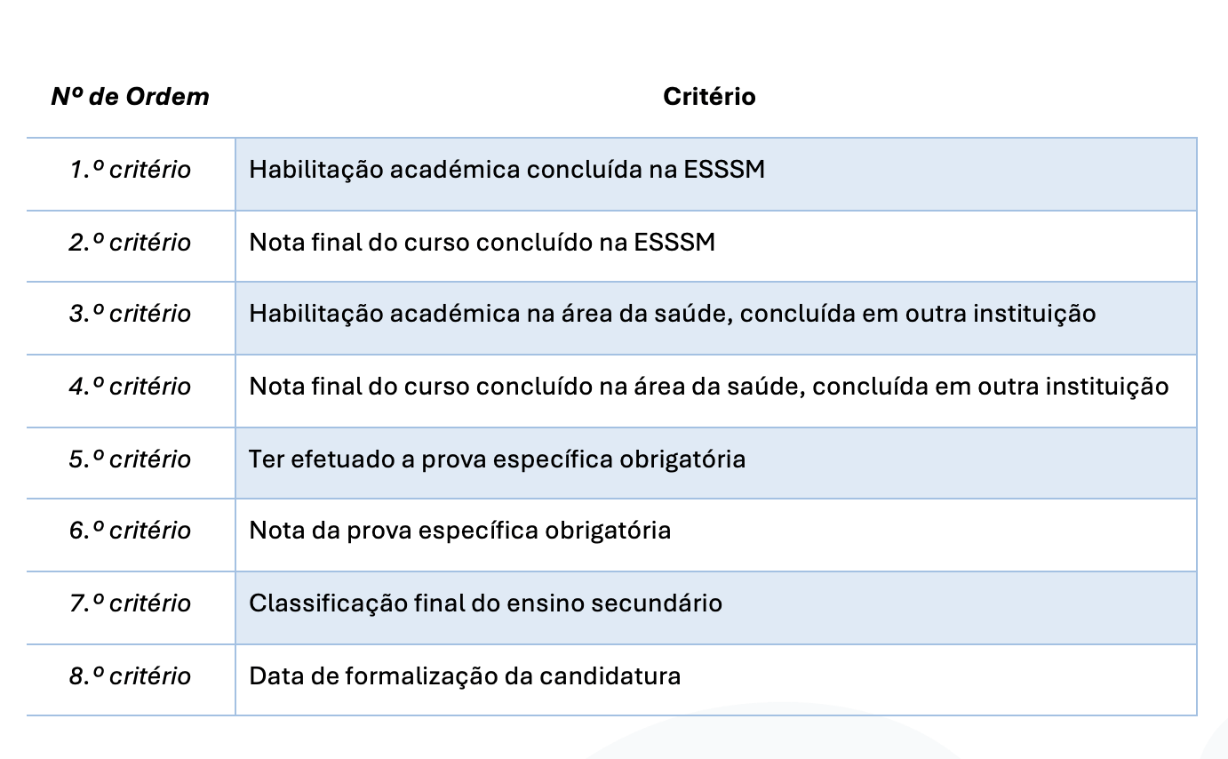 Os critérios de seriação para acesso ao Curso Técnico Superior Profissional em Gerontologia e Cuidados de Longa Duração e ao Curso Técnico Superior Profissional em Secretariado Clínico são os seguintes: