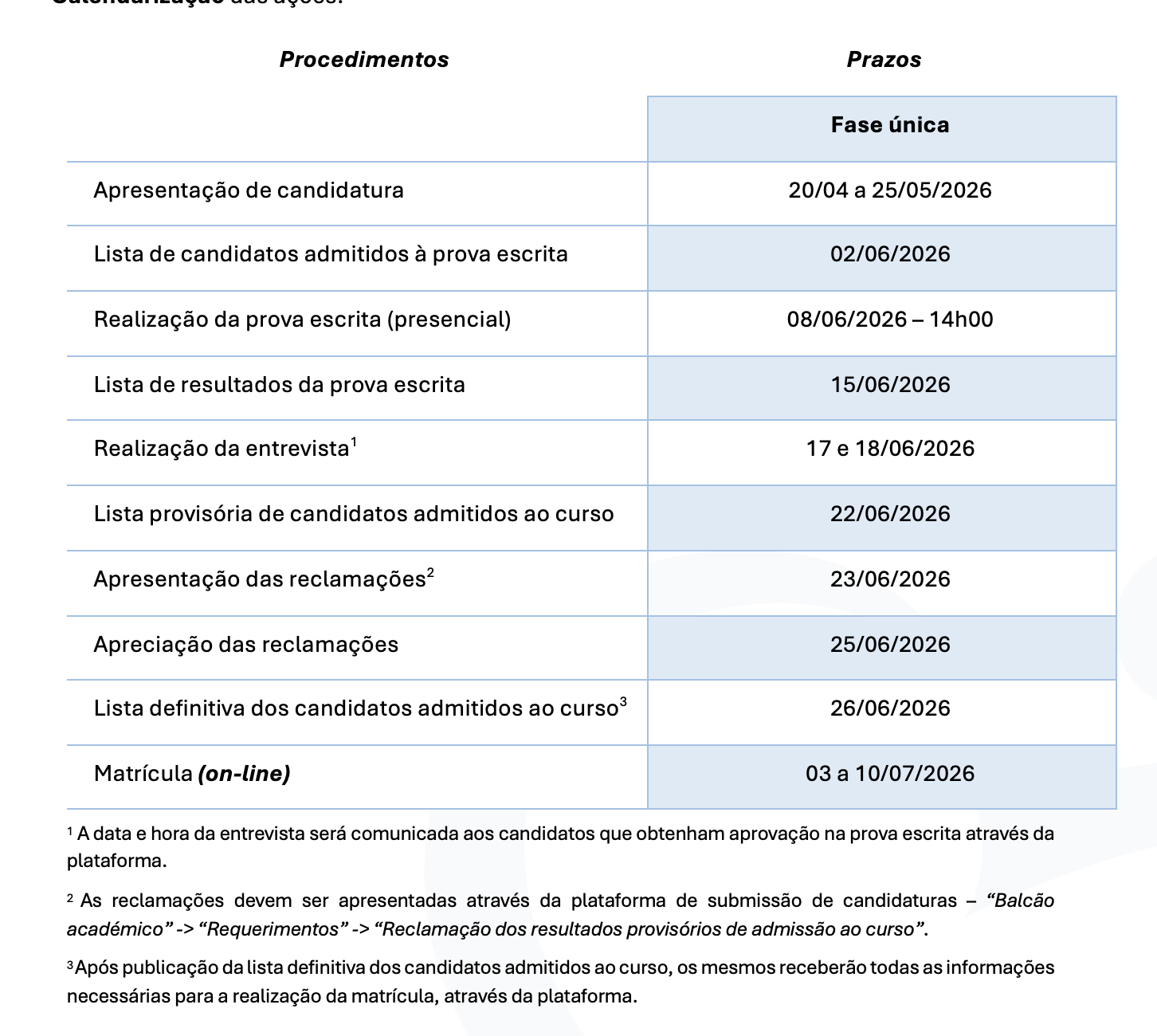 • Para o ano letivo 2026/2027, torna-se público que os conteúdos programáticos das disciplinas abordadas na prova escrita de avaliação de conhecimentos e capacidade de expressão, serão: