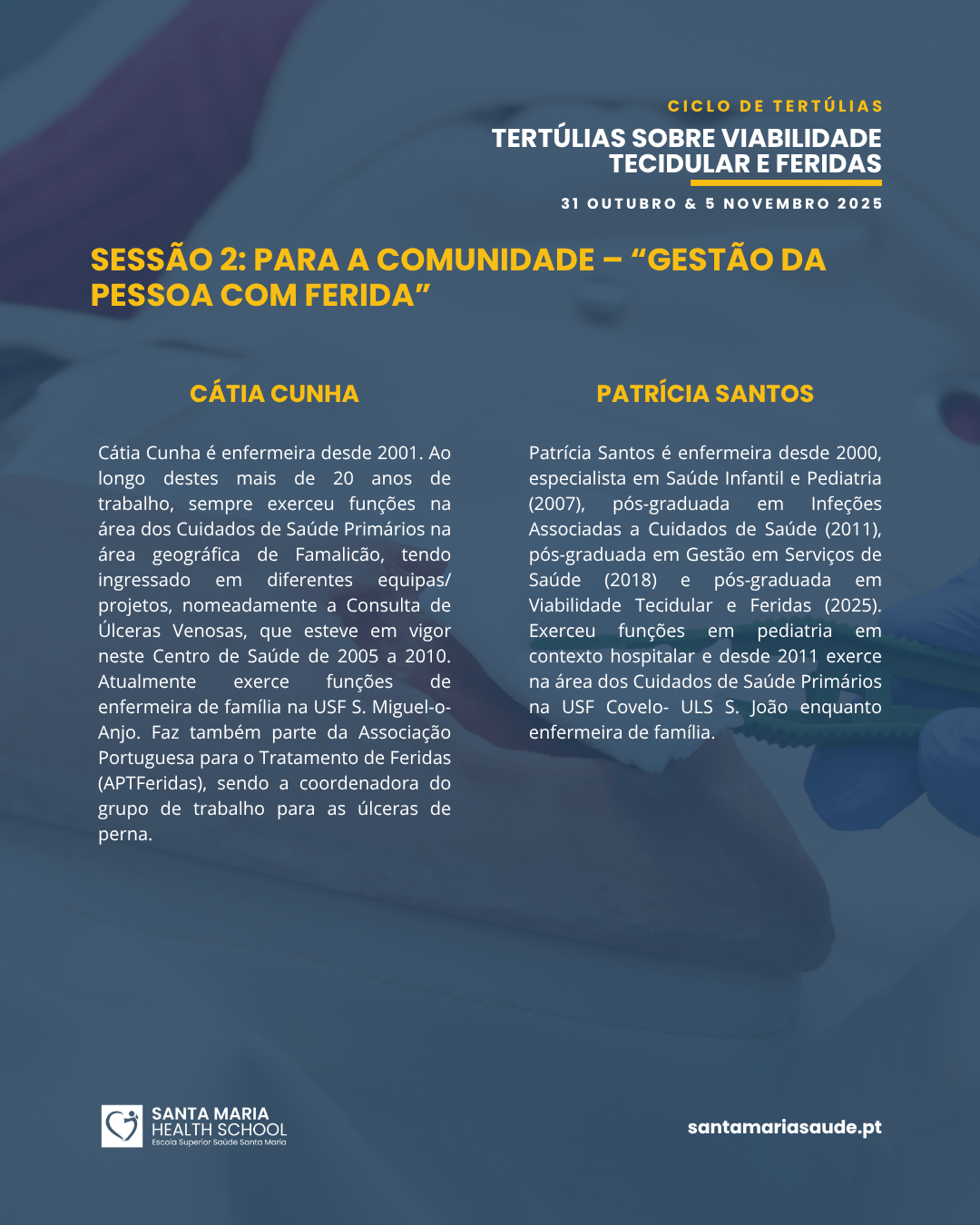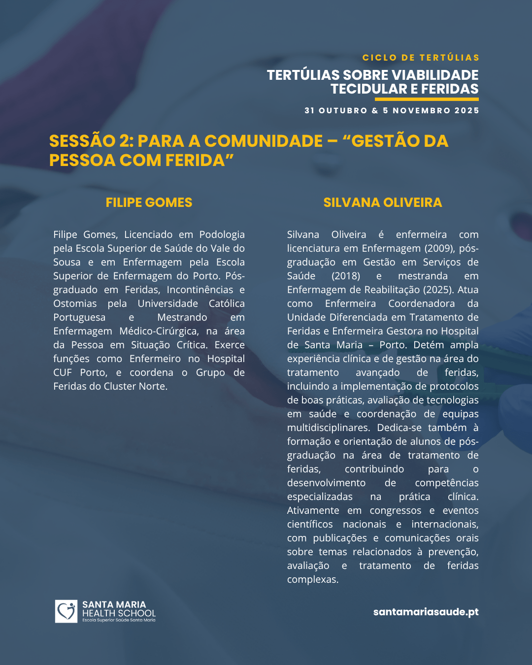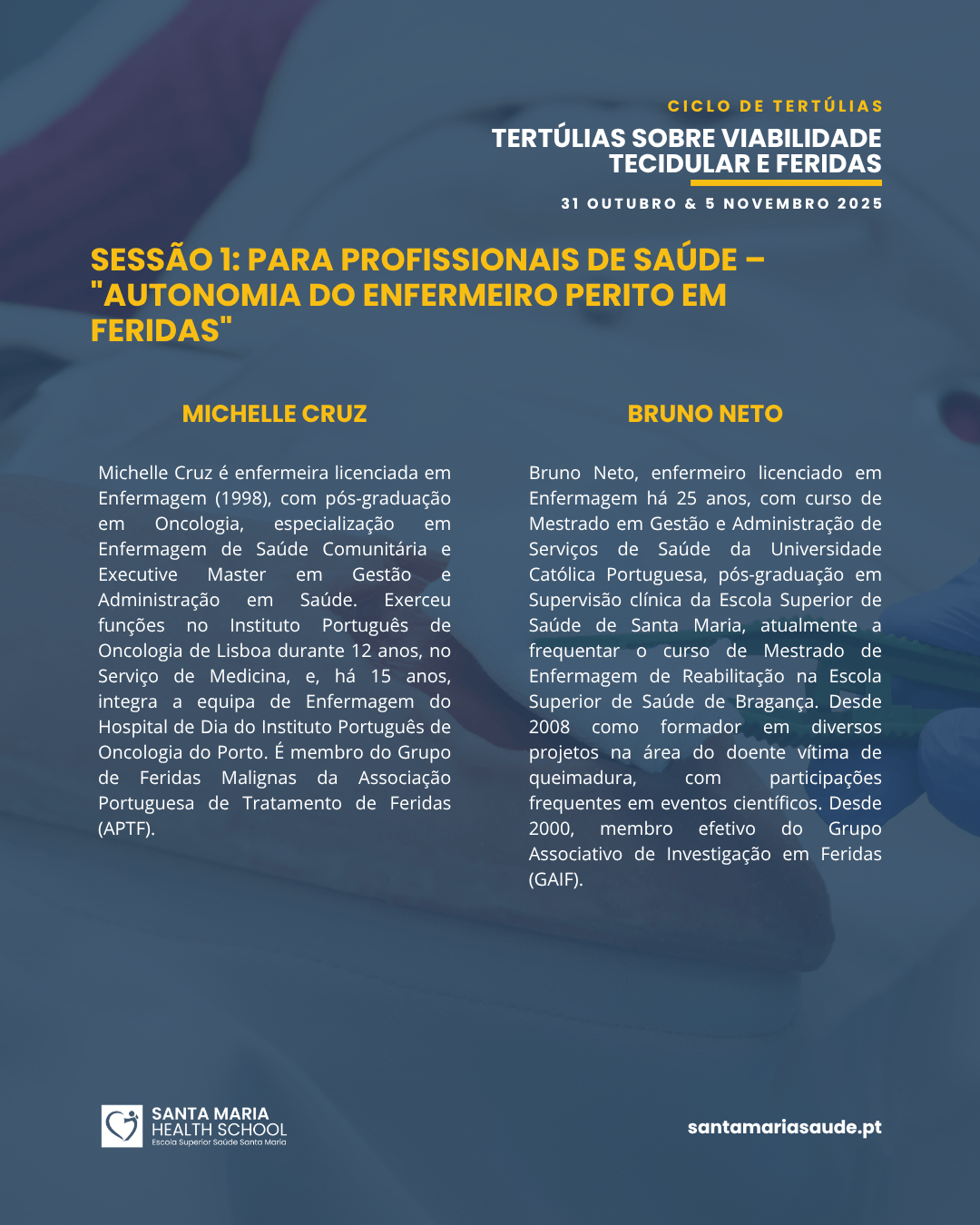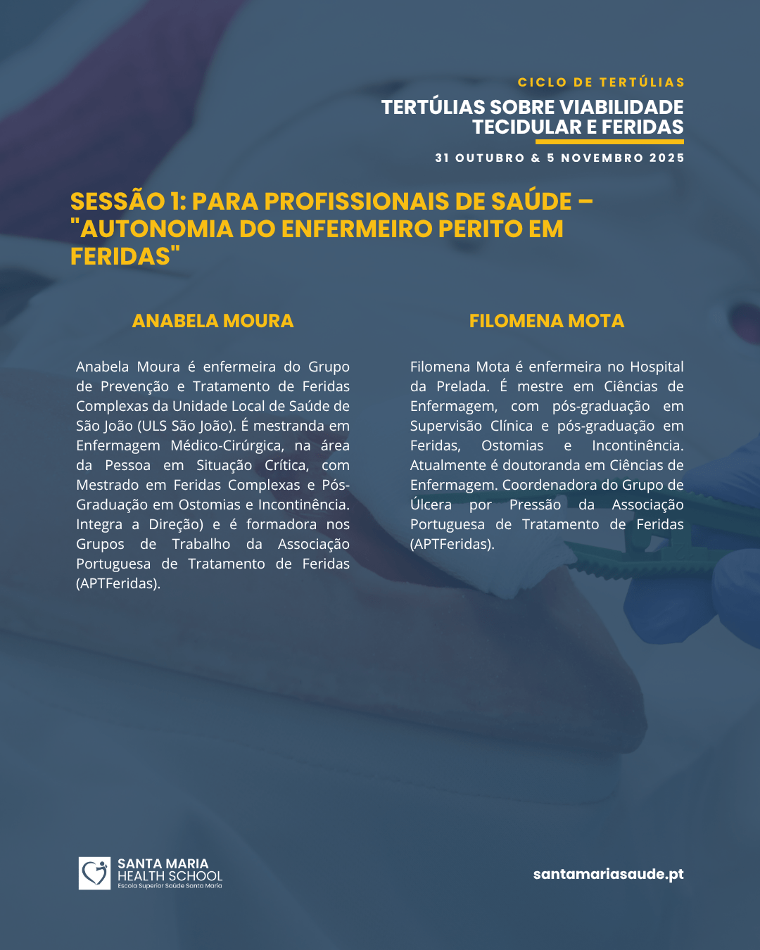 A Santa Maria Health School – Escola Superior de Saúde Santa Maria (Porto) promove um ciclo de Tertúlias sobre Viabilidade Tecidular e Feridas, que decorrerão nos dias 31 de outubro de 2025, nas instalações da Santa Maria Health School e 5 de novembro de 2025, nas instalações do Hospital de Santa Maria Porto.