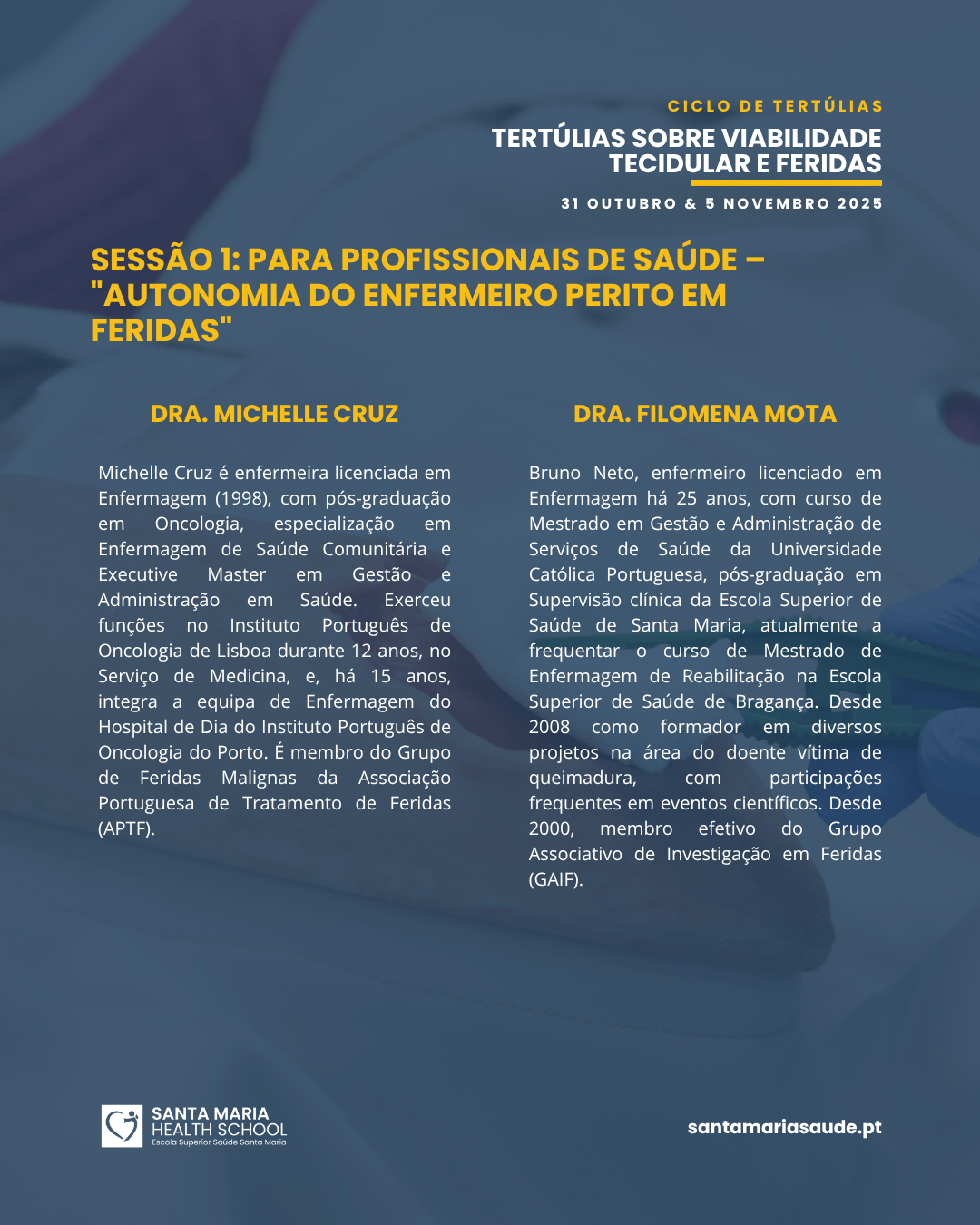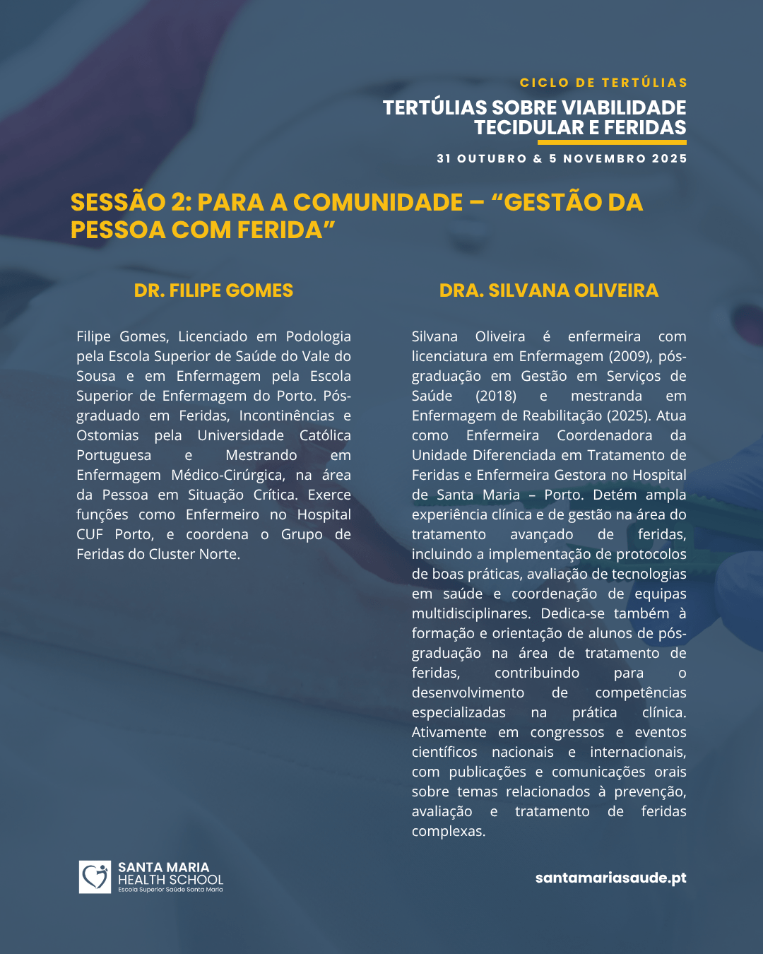 Santa Maria Health School – Escola Superior de Saúde Santa Maria (Porto) promove um ciclo de Tertúlias sobre Viabilidade Tecidular e Feridas, que decorrerão nos dias 31 de outubro de 2025, nas instalações da Santa Maria Health School e 5 de novembro de 2025, nas instalações do Hospital de Santa Maria Porto.